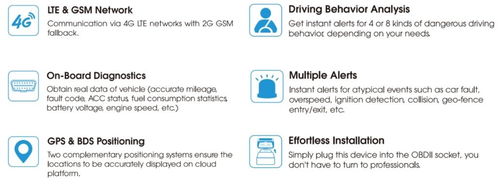 The VL502 is a new generation of 4G Cat 1 OBDII tracker for corporate cars, usage-based insurance, fleet management, and individual cars, which can obtain vehicle data such as VIN code, engine speed, water temperature, accumulated mileage, etc. With the UBI-based algorithm for driving behavior analysis, the VL502 can accurately analyze any of 4 kinds of dangerous driving behavior and support the all-round monitoring of vehicles’ real-time status.