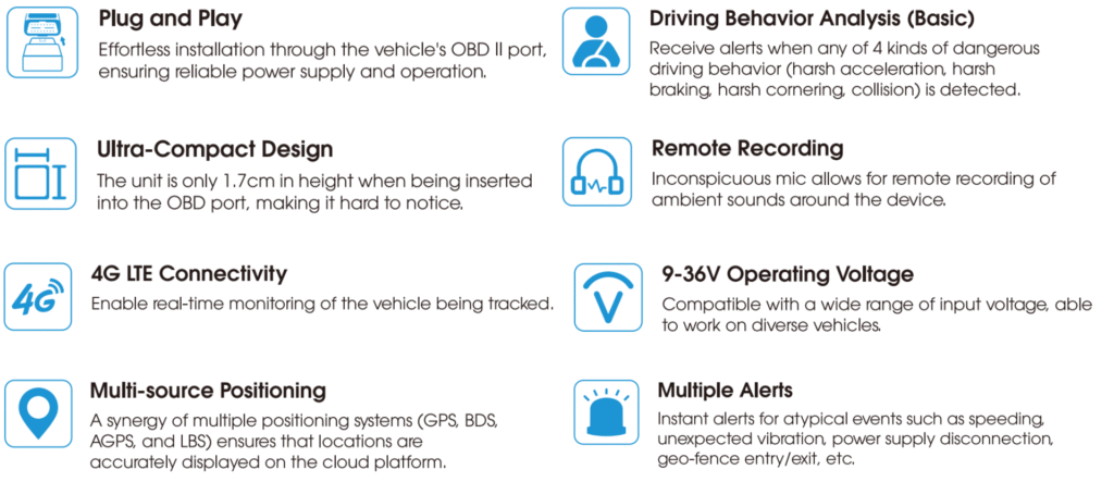 The VL505 is an ultra-compact plug-and-play 4G OBD tracking unit designed for use in both private cars and commercial fleets. Its 4G connectivity ensures real-time data transmission; while the multi-source positioning (GPS, BDS, and LBS) provides accurate location tracking. Operating over a wide voltage range (DC 9–36V), it easily adapts to different makes and models. In addition, the VL505 offers an array of valuable alerts, including geofencing, unexpected vibration, speeding, and power failure, ensuring 24/7 protection for your fleet vehicles and cargo as long as it remains connected. It is a proper choice if you want to increase efficiency, reduce costs, and enhance security.